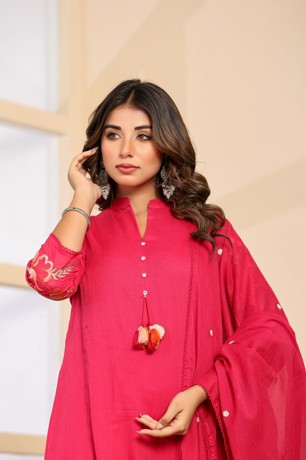 Crafted from premium mulmul cotton, this three-piece ensemble combines breathable comfort with refined artistry. The intricately embroidered kurta showcases detailed needlework that elevates everyday wear into something special. Paired with a coordinated pant for a polished silhouette and a flowing dupatta to complete the look, this set offers versatility for both casual occasions and festive gatherings. The natural fabric ensures all-day comfort while the embroidery adds a touch of traditional elegance to your wardrobe.